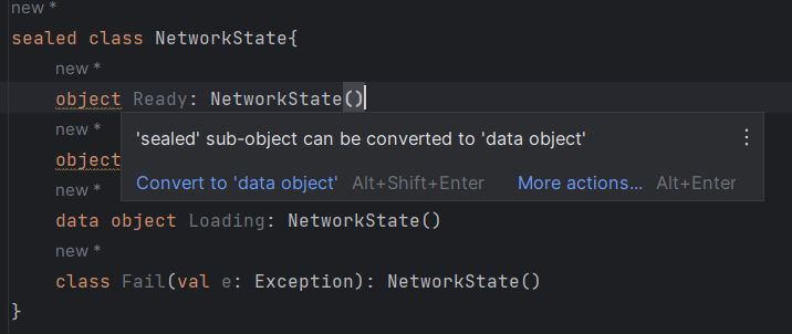 Convert sealed subclass to object를 클릭하면 다음과 같이 코드가 변경됩니다.