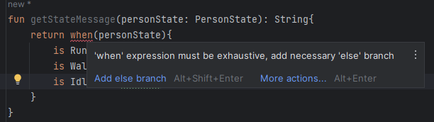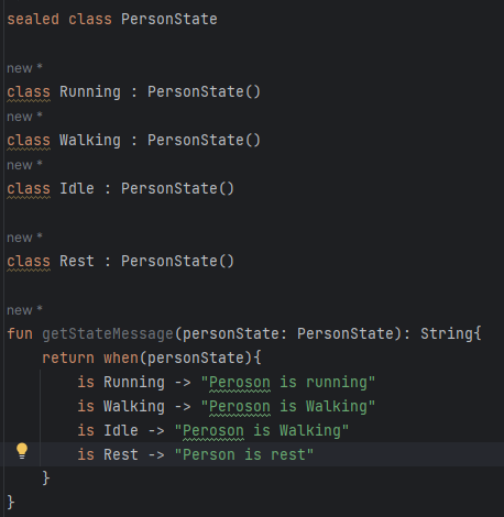 sealed class PersonState의 자식 클래스에는 Running, Walking, Idle 세 가지만 가지고 있는 것을 알고 있기 때문에 일반 추상 클래스를 사용할 때와 달리 else branch에 대한 오류가 발생하지 않습니다.