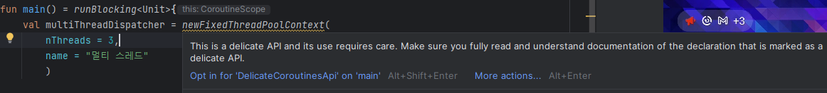 눈치 빠르신 분들은 아시겠지만 newFixedthraedPoolContext 함수를 사용해 CoroutineDispatcher를 만들면 IDE에선 경고가 출력됩니다.
