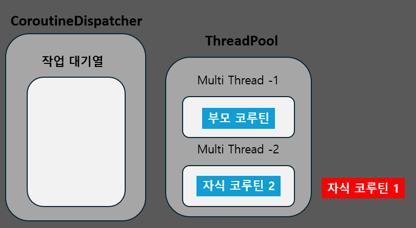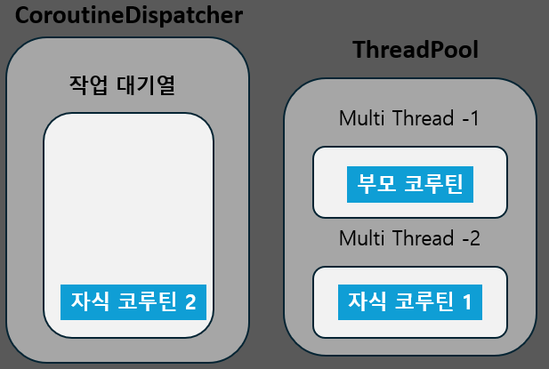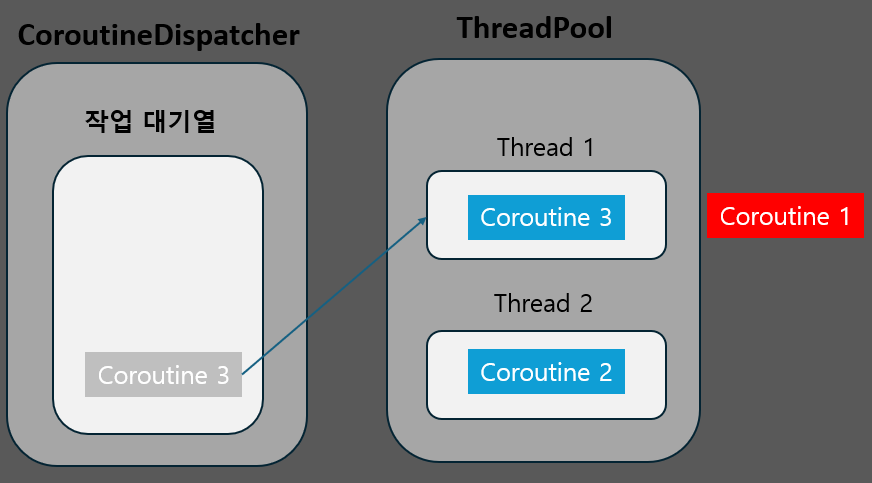 - CoroutineDispatcher는 새로 요청받은 코루틴 2를 작업 대기열에 대기시켰다가 사용 가능한 Thread가 있다면 해당 Thread로 코루틴을 전송해 실행시킵니다.