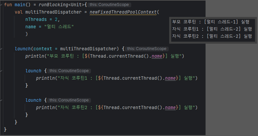 🤔 왜 자식 코루틴이 모두 멀티 스레드 2에서 실행될까요?