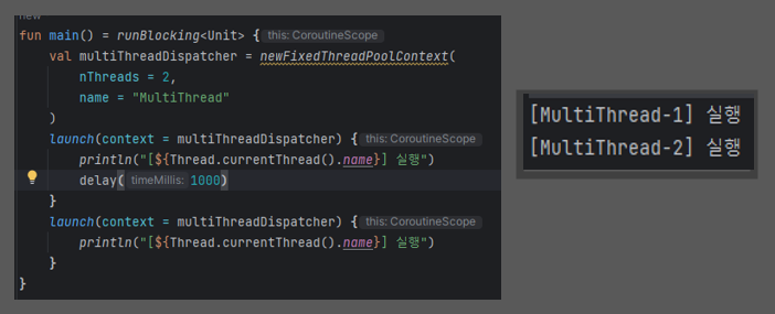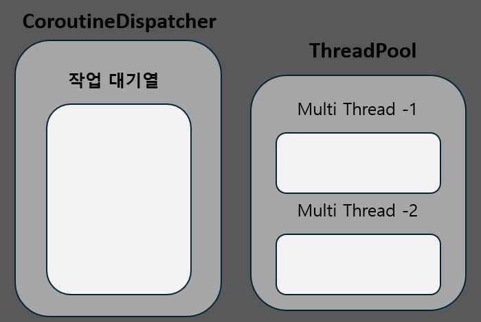 - 멀티 스레드 디스패처 : 2개 이상의 스레드를 사용할 수 있는 CoroutineDispatcher