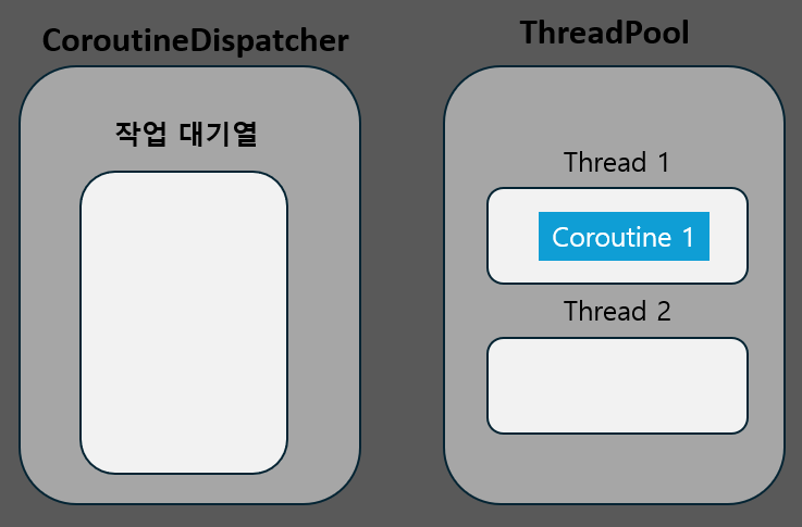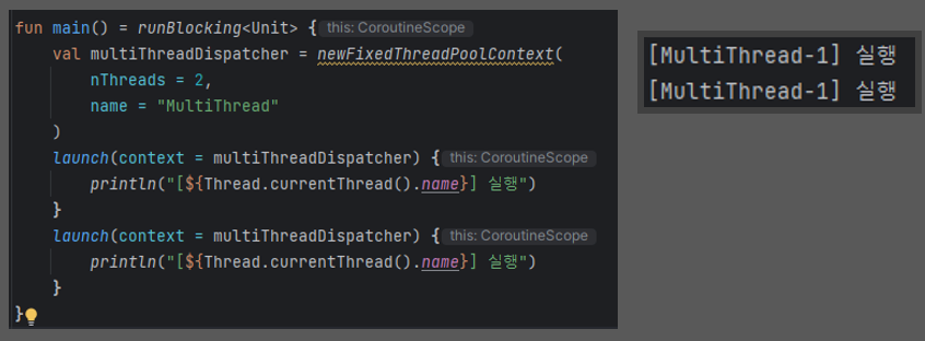 - 단일 스레드 디스패처 : 사용할 수 있는 스레드가 하나인 CoroutineDispatcher