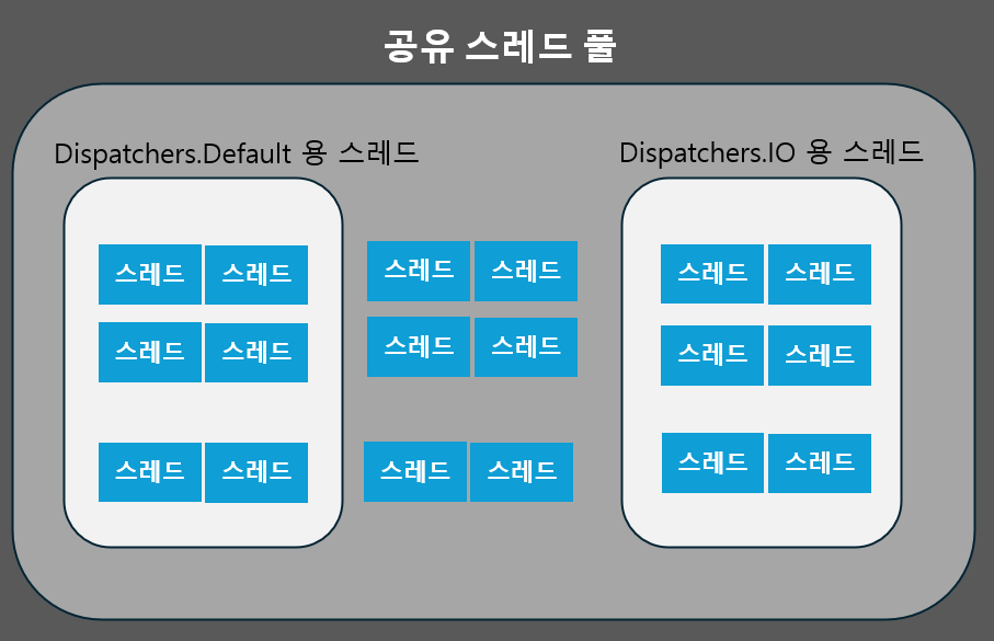 위 Dispachers의 실행 결과를 보면 모두 코루틴을 실행시킨 스레드의 이름이 DefaultDispatcher-worker-1입니다. 이것이 가능한 이유는 두 Dispatchers 모두 코루틴 라이브러리에서 제공하는 같은 공유 스레드 풀을 사용하기 때문입니다.
