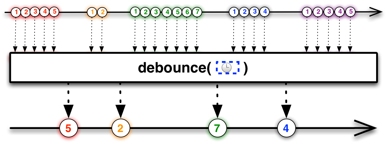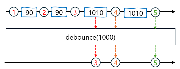 Debounce를 그림으로 표현하면 위 사진처럼 동작합니다. 1 ~ 5번의 이벤트를 수행하던 1 ~ 2의 이벤트, 1 ~ 7 등 몇 번의 이벤트를 수행하던 이를 그룹화하여 debounce에 지정된 시간 동안 이벤트가 발생하지 않을 경우 가장 마지막 이벤트를 전달합니다.