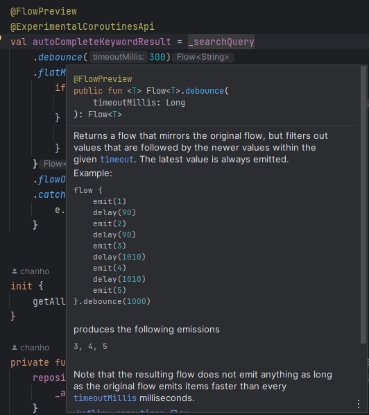 - debounce 연산을 수행하는 내부 함수 debounceInternal을 호출하여 새로운 Flow를 반환합니다. 내부 함수에는 debounce의 시간 간격을 인자로 전달합니다.