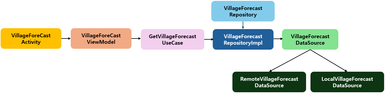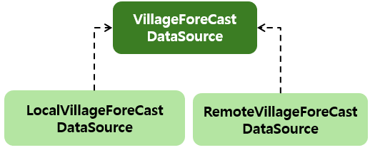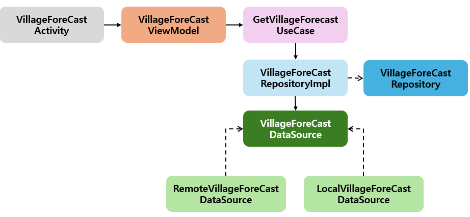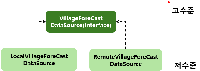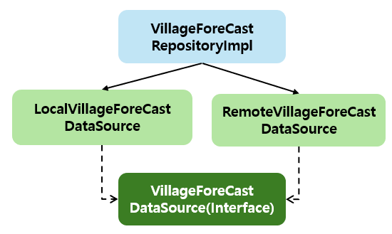 바로 다형성 덕분에 업캐스팅이 가능하기 때문입니다. 현재 VillageForecastDataSource Interface는 두 개의 자식 DataSource Class를 갖고 있습니다. 그리고 VillageForecastRepositoryImpl 클래스의 생성자에선 두 개의 VillageForecastDataSource 구현체를 전달받고 있습니다.