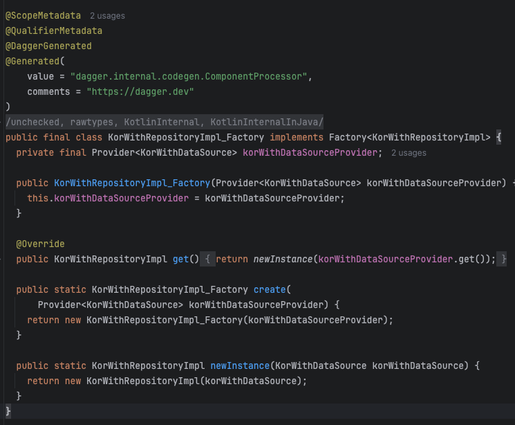 하나의 인터페스만 살펴보면 다음과 같이 구현체로 교체되어 있는 것을 확인할 수 있습니다. 그렇기 인터페이스와 구현체 간의 단순한 바인딩이라면 @Binds를 상용해 팩토리 클래스로 인한 오버헤드를 감소시킬 수 있습니다,.