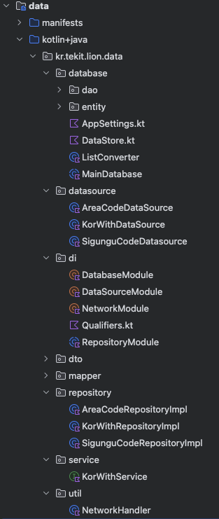 정리한 내용을 바탕으로 Data Layer의 패키지를 나누었습니다. 정리한 내용 외에도 추가된 두 가지 패키지가 있습니다. mapper package는 특정 타입을 매핑하기 위한 확장 함수, Network Handler Class는 네트워크 에러를 처리하기 위해 만들었습니다. 이 내용은 추후 다루며 각 패키지 구현 내용과 클래스에 대해 더 살펴보겠습니다.