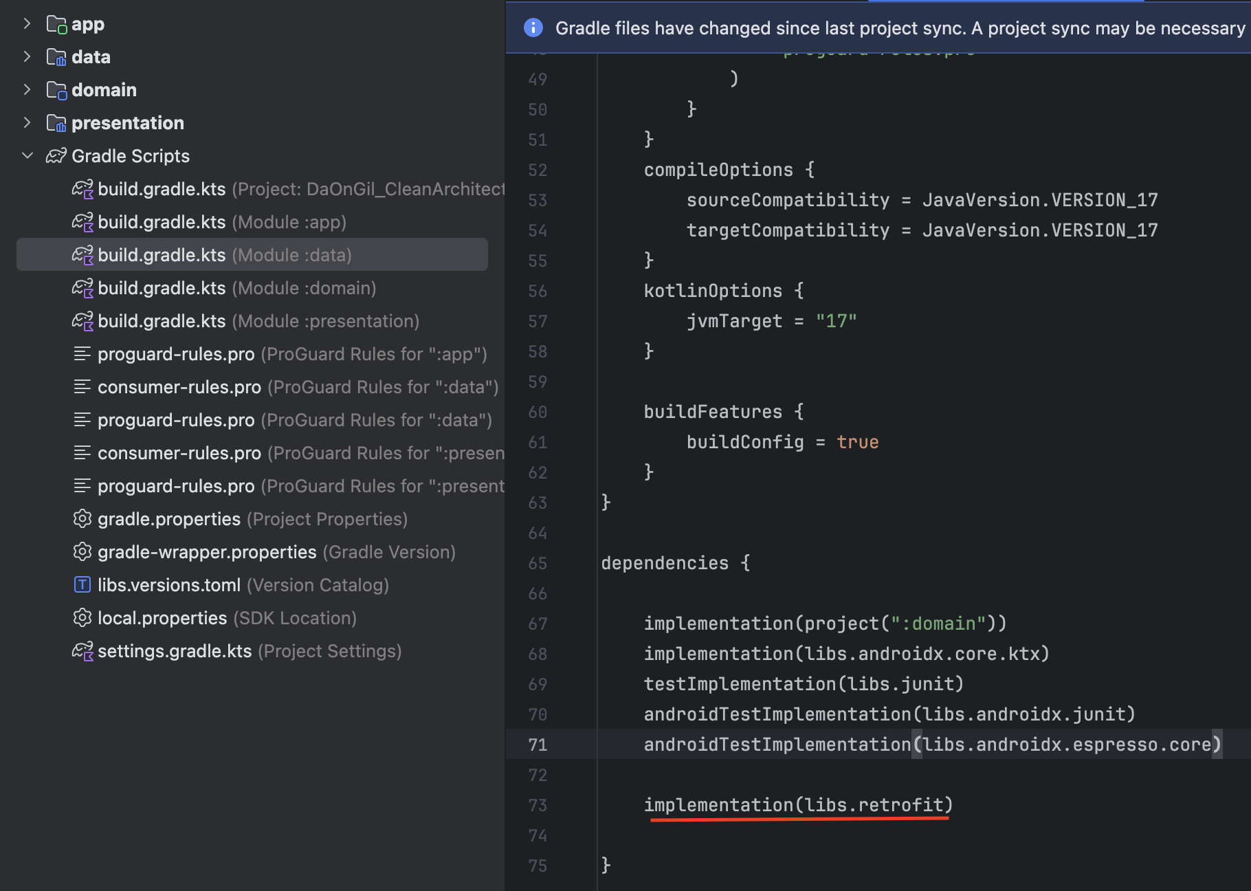 프로젝트를 만들고 가장 먼저 할 일은 클린 아키텍처에 기반하여 모듈을 나누는 일입니다. Presentation과 Data, App은 플랫폼의 의존성을 가져야 하기 때문에 Android Library로, Domain 모듈은 순수 프로그래밍 언어만 존재해야 하기 때문에 Java or Kotlin Library로 만들어 주었습니다.