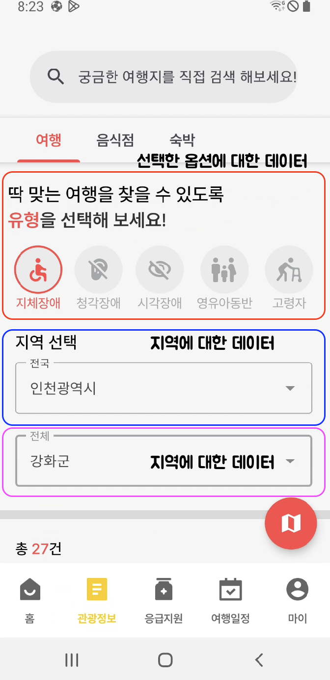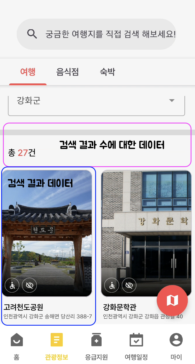 리스트를 초기화가 완료됐다면 4번에 해당하는 관광지 검색 결과 추가해야 합니다. listOptionState는 1번에 있는 버튼들을 클릭했을 때 선택한 옵션들입니다.
