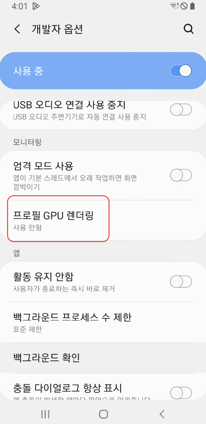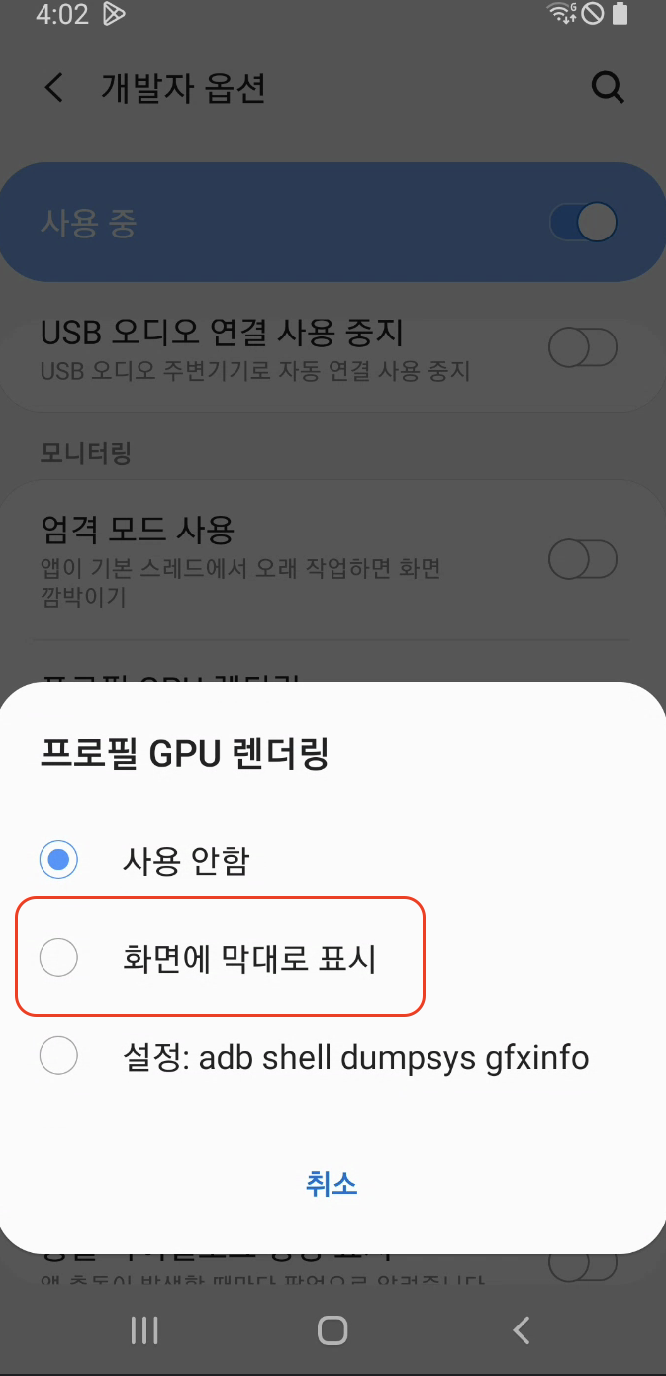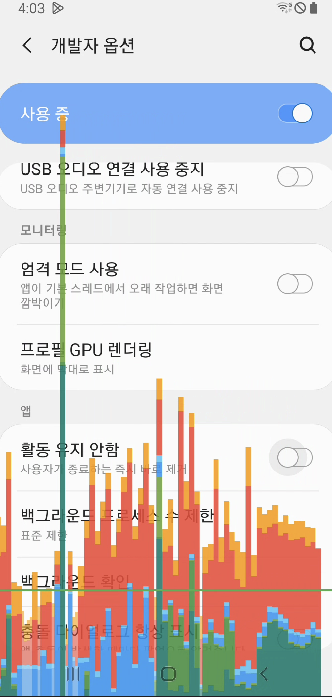 안드로이드 스마트폰의 개발자 옵션에서 설정할 수 있는 프로필 GPU 렌더링은 현재 화면에서 실행중인 어플리케이션의 렌더링 시간을 막대 형태로 보여줍니다. 각각의 수직 막대는 한 프레임인데 높이가 높을수록 렌더링에 오랜 시간이 소요됐음을 뜻합니다.