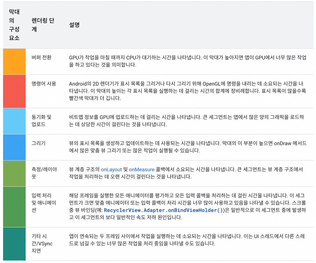 막대를 보시면 다양한 색상으로 이루어져 있는 것을 알 수 있습니다. 먼저 안드로이드 공식 문서에서 설명하는 각 막대가 의미하는 바는 다음과 같습니다.