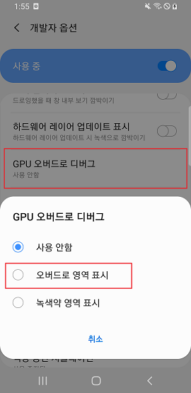 GPU 오버드로 디버그는 다음과 같이 개발자 옵션 -> 하드웨어 가속 렌더링 섹션 -> GPU 오버드로 디버그로 설정할 수 있습니다.