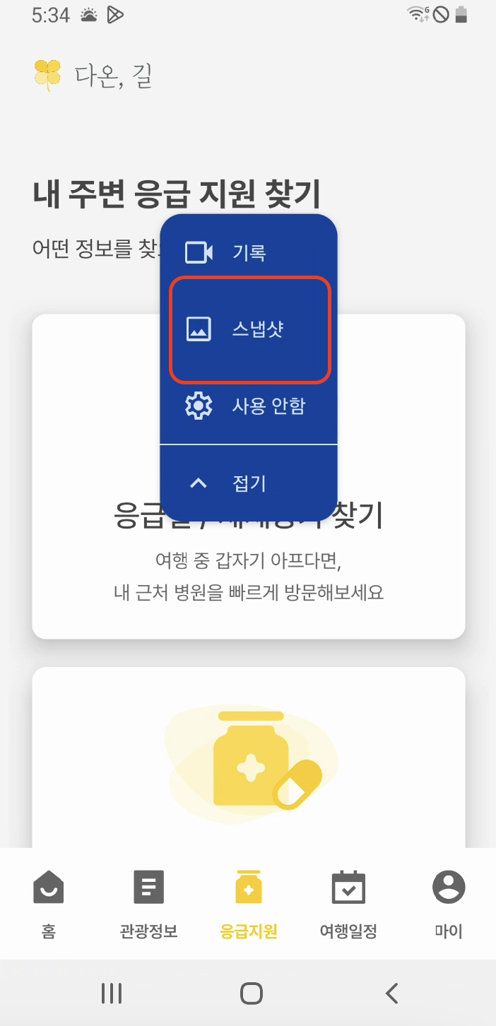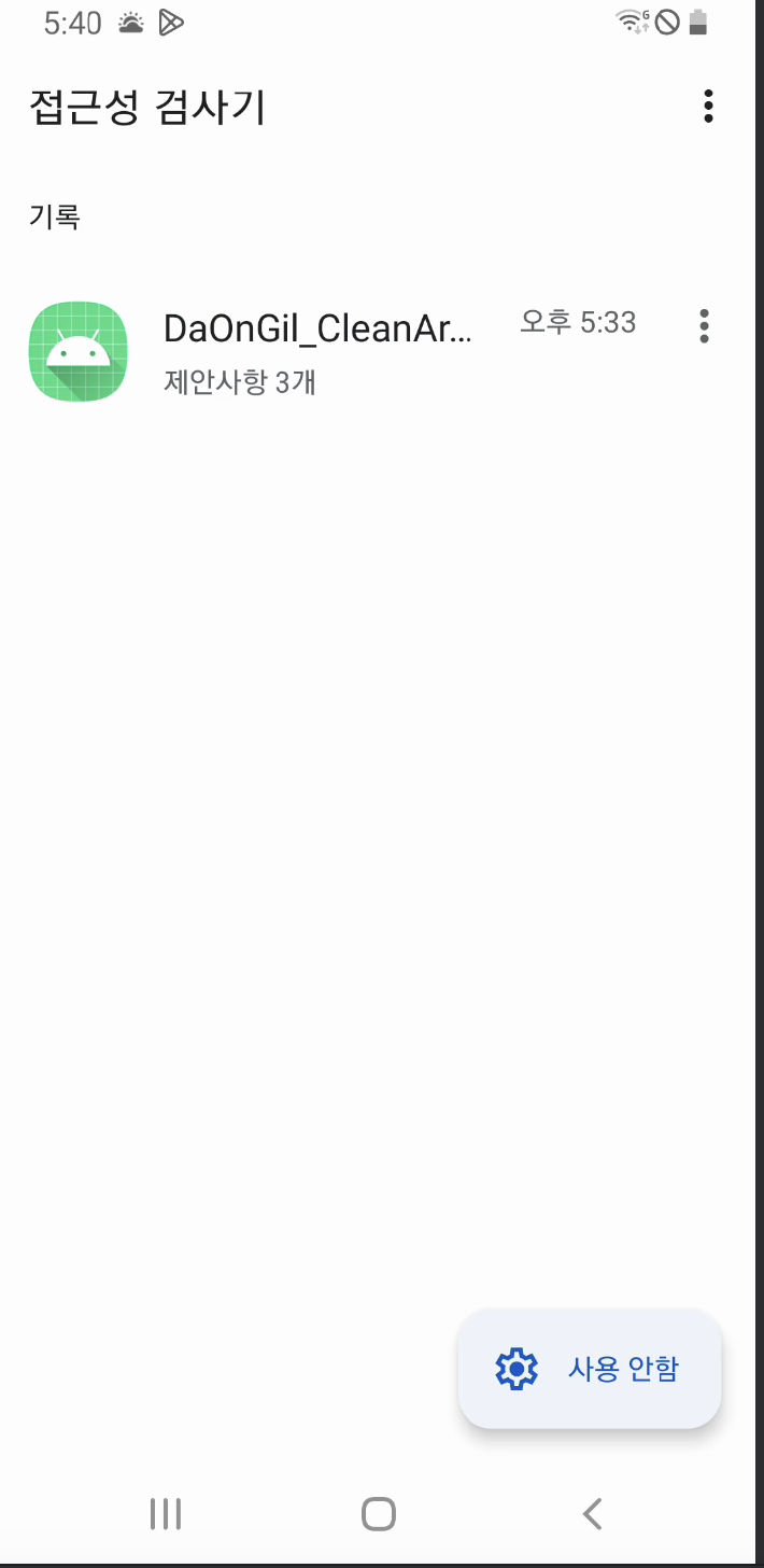 접근성 검사기를 활성화하면 핸드폰 상단에 버튼이 활성화됩니다. 이 버튼을 클릭 후 스냅샷을 선택 후 개발 중인 어플리케이션에서 접근성을 검사하고 싶은 화면을 열면 자동으로 캡처하고 캡처된 이미지를 검사해 접근성 검사기 앱에서 분석 내용을 확인할 수 있습니다.