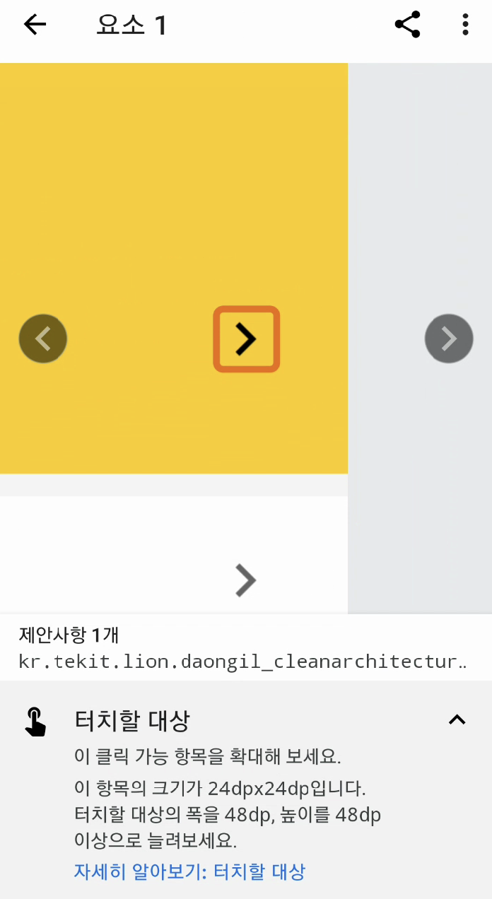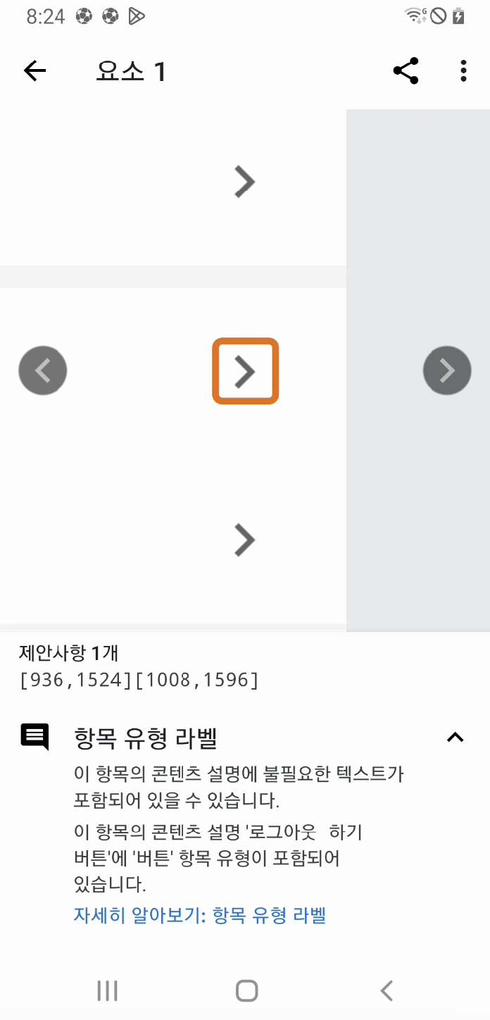 기존 프로젝트에서 버튼이 있는 화면에서 접근성 검사기로 검사를 실행해 봤습니다. 해당 화면에선 두 가지 개선사항이 필요했습니다. 다음과 같이 버튼 크기가 48dp 미만이기 때문에 터치 영역을 늘리고 불필요한 contentDescription을 제거할 것을 권장했습니다. contentDescription에 대한 내용은 뒤에서 더 알아보겠습니다.