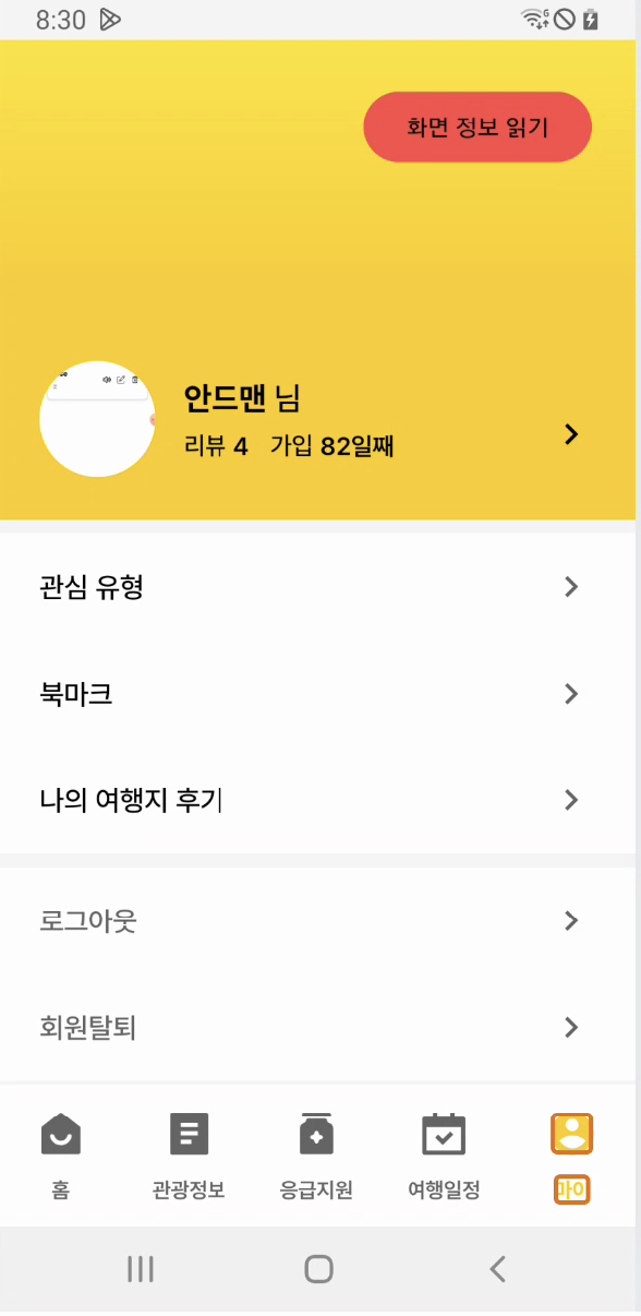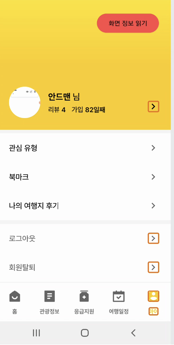 현재 사용자의 정보는 서버에서 받아오는 데이터입니다. labelFor는 동적으로 변경되는 텍스트는 읽어주지 않습니다. 즉, 서버에서 받아온 데이터를 텍스트 뷰에 표시하더라도 android:labelFor 속성은 XML에 정의된 텍스트만 읽어줍니다. 이 문제를 해결하기 위해 저는두 가지 과정을 거쳐 항목의 타이틀을 선택했을 때 TallBack에서 읽어줄 텍스트를 직접 지정해 주었습니다.