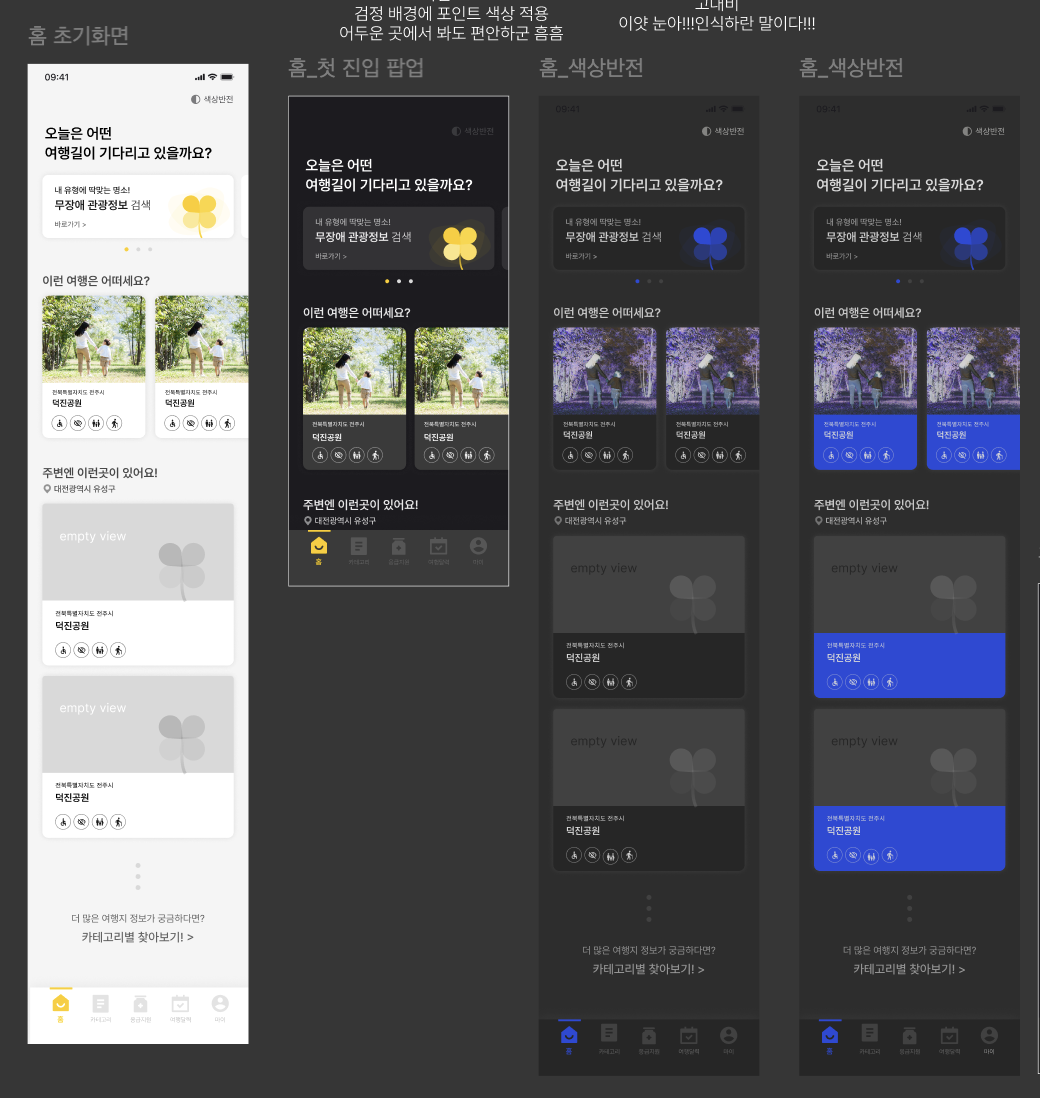 저희 프로젝트에선 앱 초기 설계 단계에서부터 저시력자들을 위해 기존 디자인에서 색상을 반전시킨 고대비 모드를 설계했습니다. 그래서 기존 디자인에 대해선 접근성에 대한 걱정을 하지 않습니다. 하지만 접근성에 대해 공부하면서 기존 디자인에서도 몇 가지 문제점을 발견했습니다. 문제점을 살펴보기에 앞서 먼저 접근성 검사기를 사용해 기존 화면에 대한 접근성을 검사하는 법과 두 번째 가이드라인인 더 큰 터치 영역 사용에 대해 알아보겠습니다.