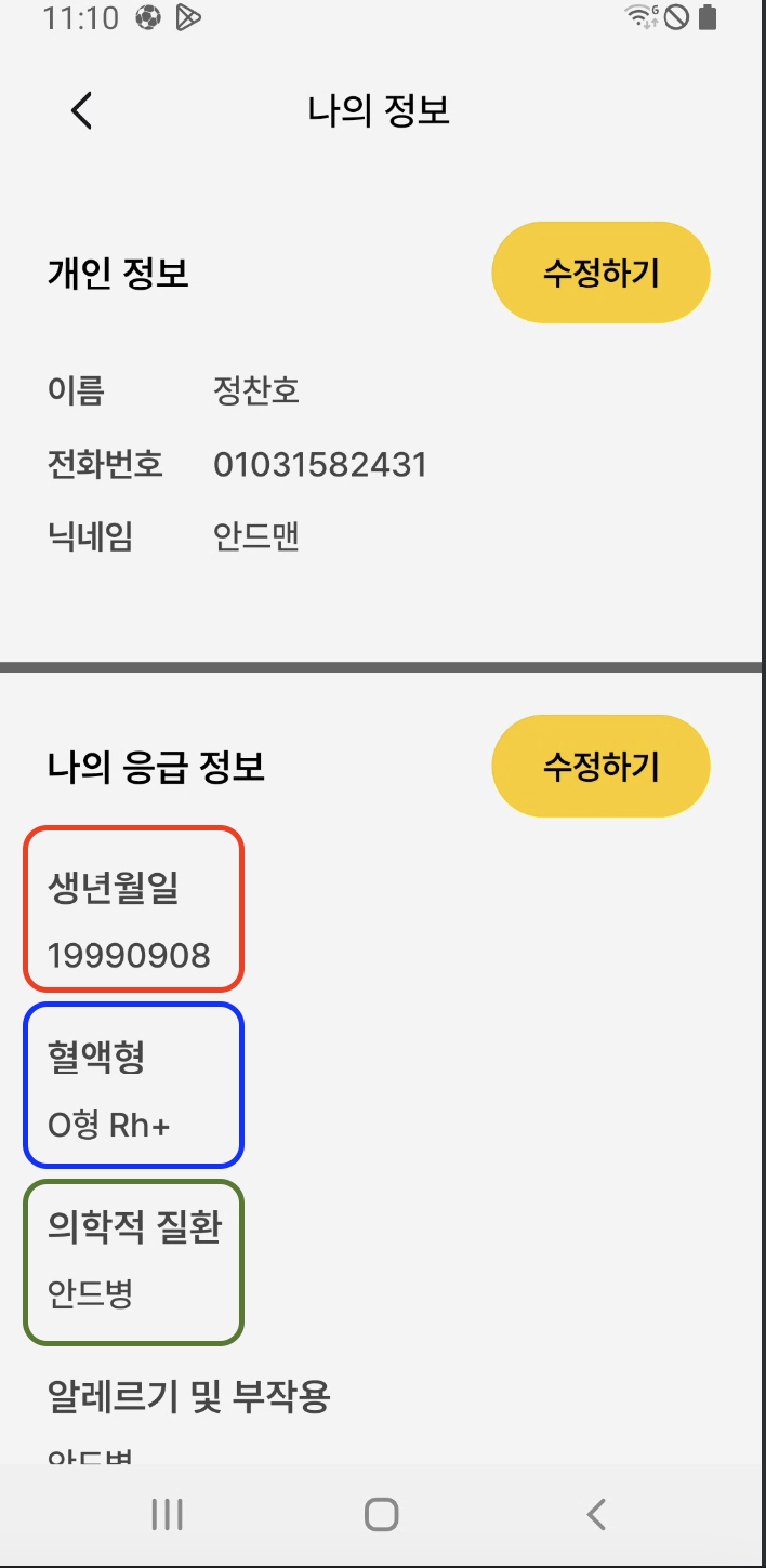 아래와 같은 화면이 있을 때 tallback은 각각의 요소들을 설명할 때 각 View의 단일 요소만 읽어줍니다. 하지만 아래 그림 같이 생년월일, 혈액형 등등의 요소들은 각 요소의 이름만 선택했을 때 그에 해당하는 데이터도 같이 읽어주는 것이 더 좋은 접근성을 만들겠죠. 이때 사용되는 속성이 바로 labelFor입니다. 만약, 여러 개의 View를 연속해서 읽고 싶다면 해당 View를 하나의 ViewGroup으로 묶어야 하지만 지금처럼 단일 속성들은 간단하게 labelFor 속성을 사용해 지정할 수 있습니다.