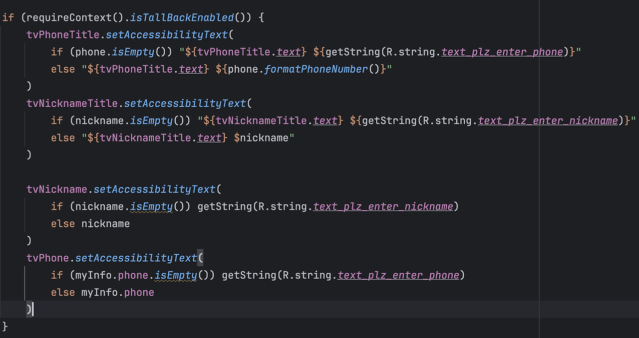 이제 이 코드를 Fragment에서 적용해 보겠습니다. 아래와 같이 함수를 적용해 주면 "닉네임"을 보여주는 TextView를 클릭하면 TallBack은 서버에서 저장된 사용자 닉네임이 있다면 "닉네임 (사용자닉네임)"을 읽어주고 만약 없다면 "닉네임 닉네임을 입력해 주세요"를 읽게 됩니다.