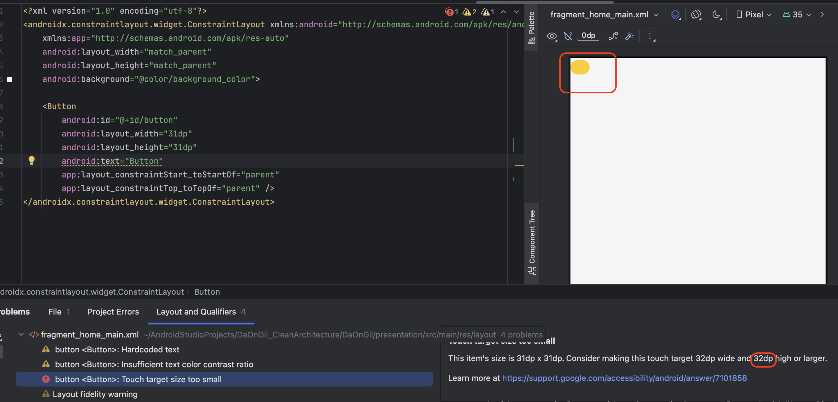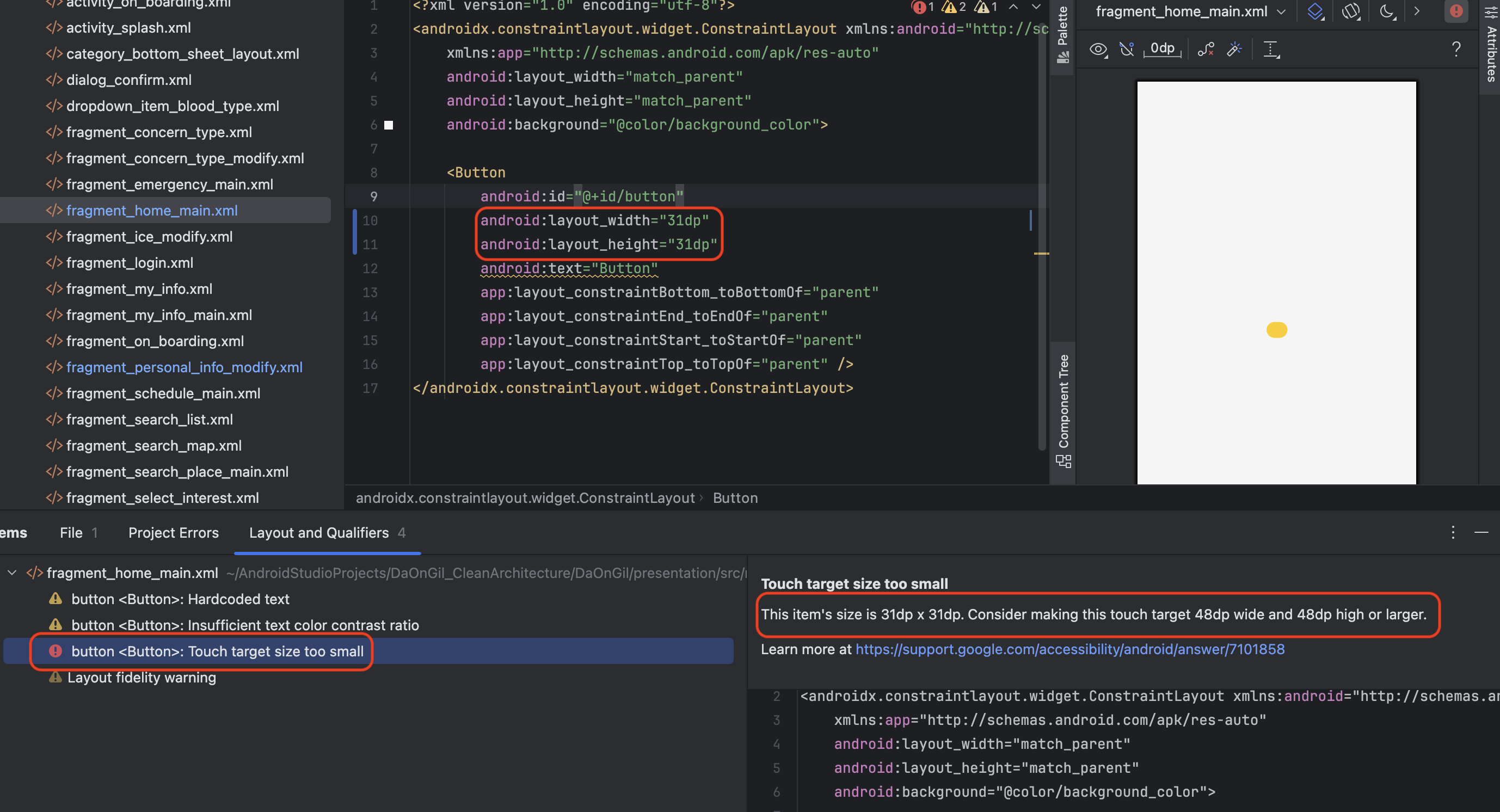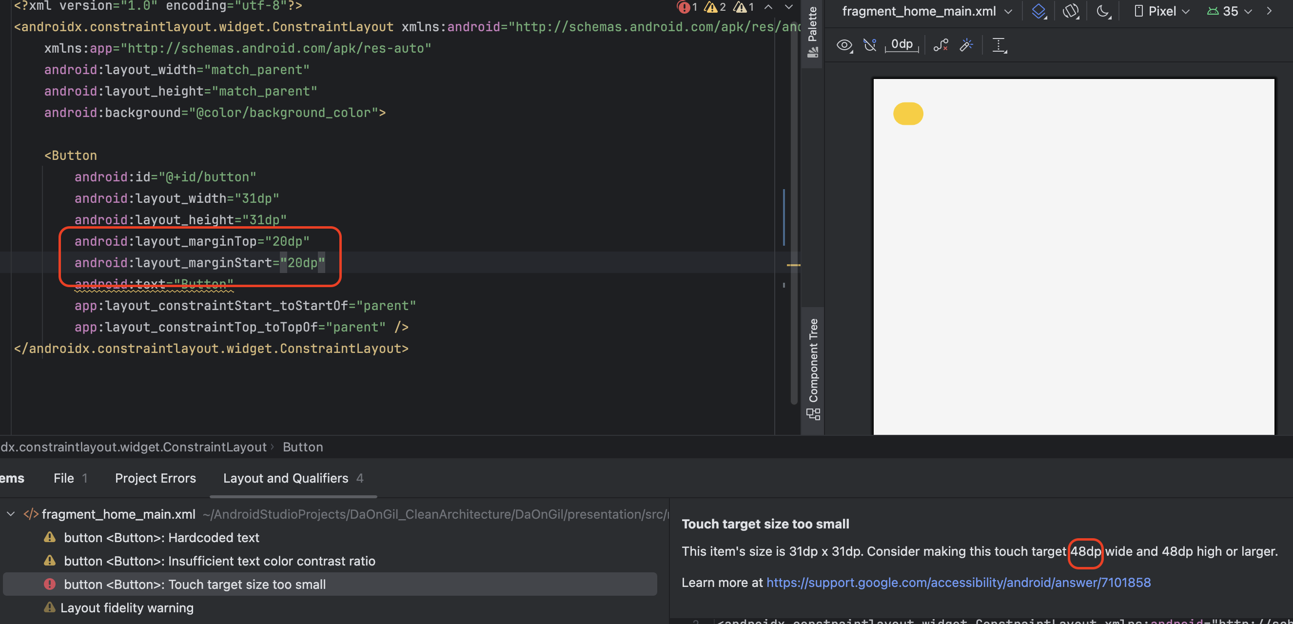 위와 같이 버튼의 사이즈를 48dp 이하로 설정할 경우 IDE에서 터치 타겟의 사이즈가 너무 작다는 Warning을 발생시키며 48dp 이상으로 사이즈를 키울 것을 권장하고 있습니다.