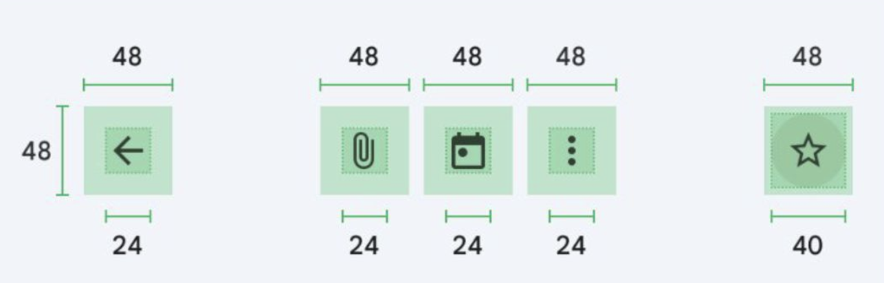 안드로이선 기본적으로 터치 요소는 minWidth, minHeight를 48dp로 할 것을 권장하고 있습니다. 48dp는 가로 세로 패딩을 포함한 사이즈며 아이콘 같은 요소는 24x24 dp로 표시될 수 있으나 요소 주변의 패딩은 48x48 dp로, 터치 영역 전체를 포함합니다. 또한 뷰의 사이즈를 변경해서 터치 영역을 개선할 때 커스텀 뷰의 사이즈 직접 조절이 어려운 경우 코드를 통해 직접 터치 영역을 조작할 수 있습니다.