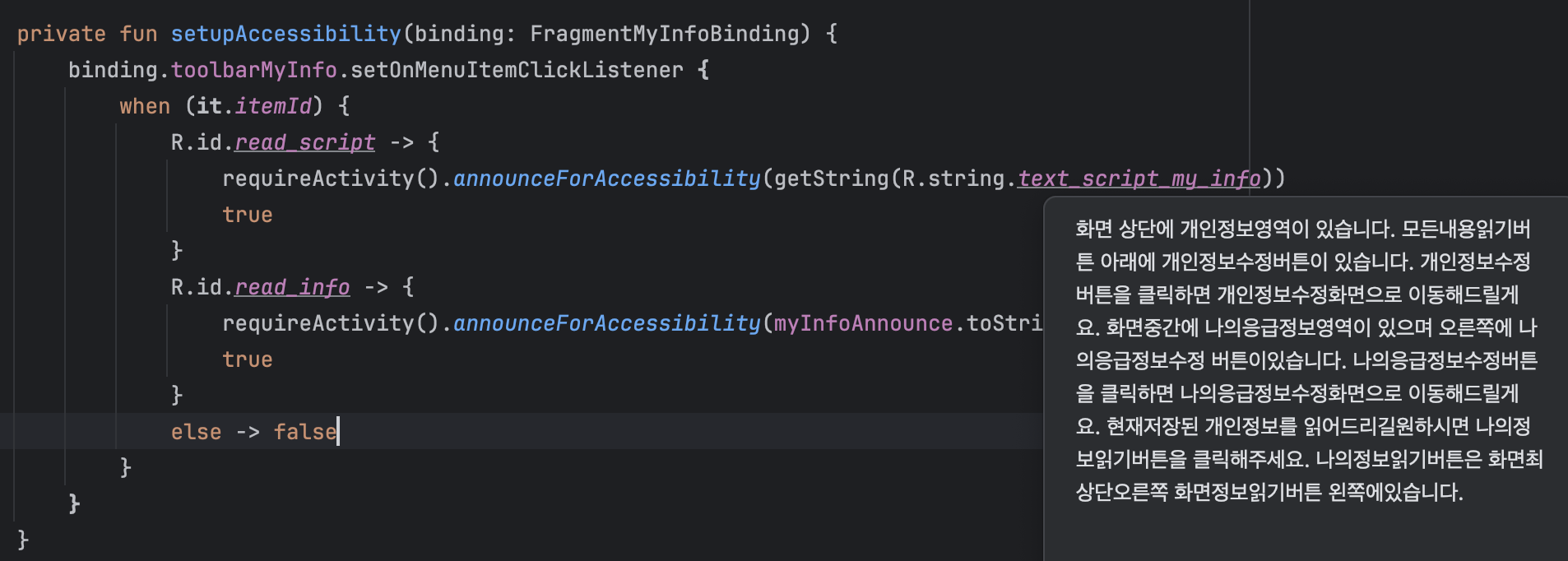 announceForAccessibility 함수는 개발자가 원하는 텍스트를 읽어주도록 만들어주는 함수입니다. 이 함수를 활용해서