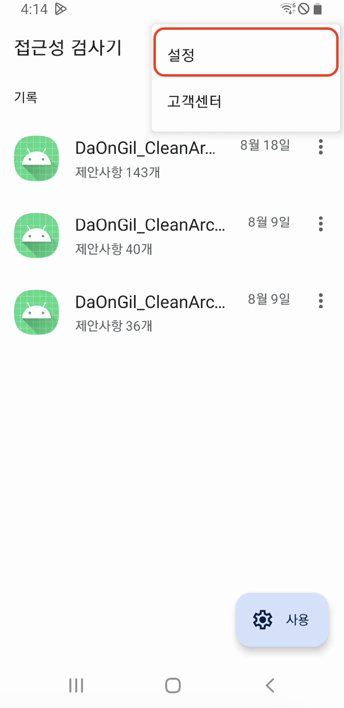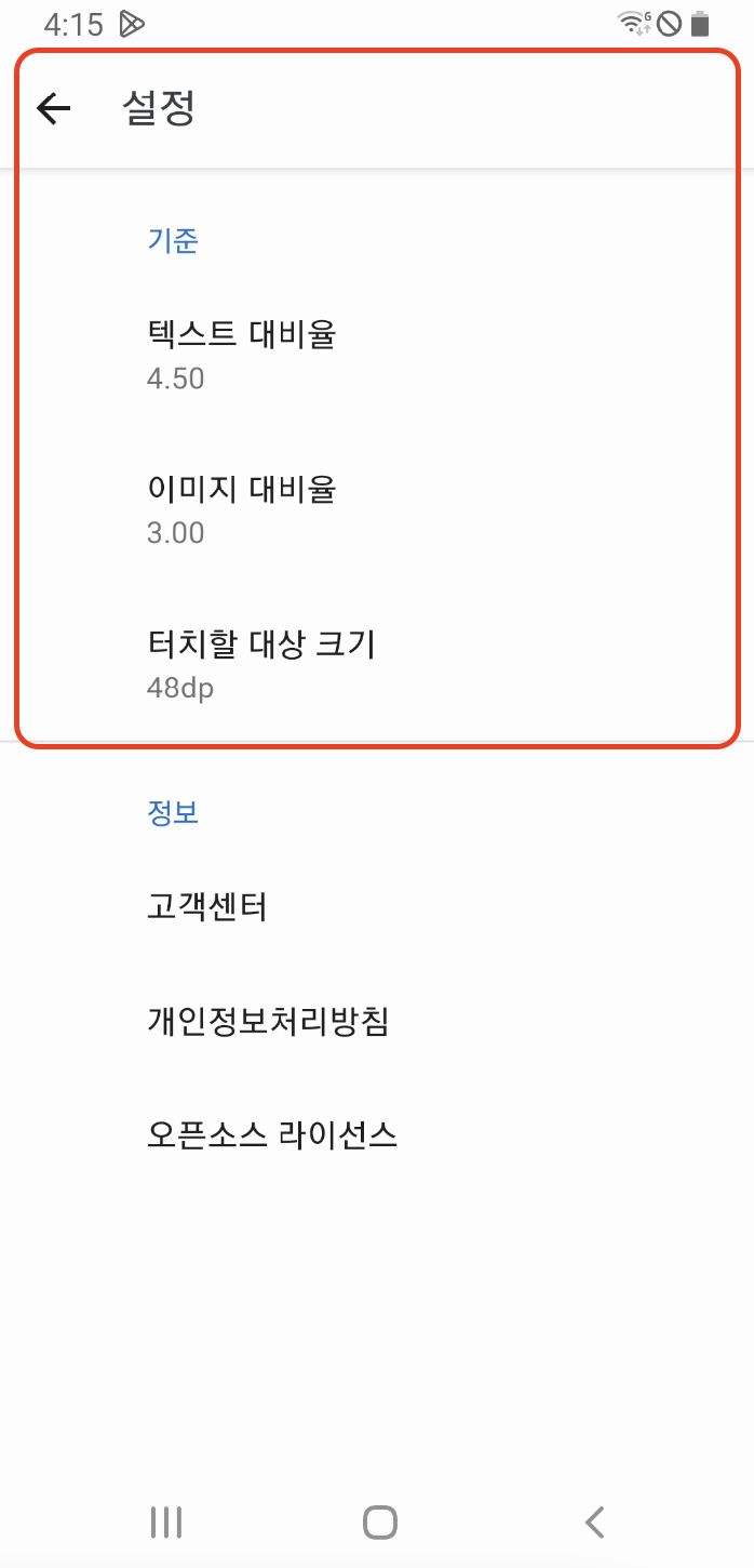 가장 먼저 접근성 검사기를 실행하면 툴바 메뉴에 설정에서 접근성 검사에 사용될 텍스트와 이미지의 대비율, 터치할 대상 크기를 설정할 수 있습니다. 기존에 설정되어 있는 값들은 모두 안드로이드 접근성 가이드 라인에서 제시한 기준값입니다.