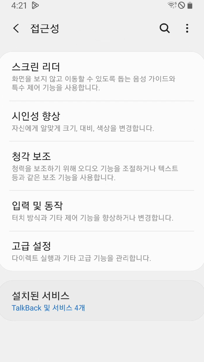 TallBack이란 Android 기기에서 제공하는 Google 스크린 리더입니다. 말 그대로 화면에 있는 요소들을 음성으로 읽어주는 역할을 합니다. TallBack은 설정 -> 접근성 또는 접근성 검사기에서 다음과 같이 설정할 수 있습니다.