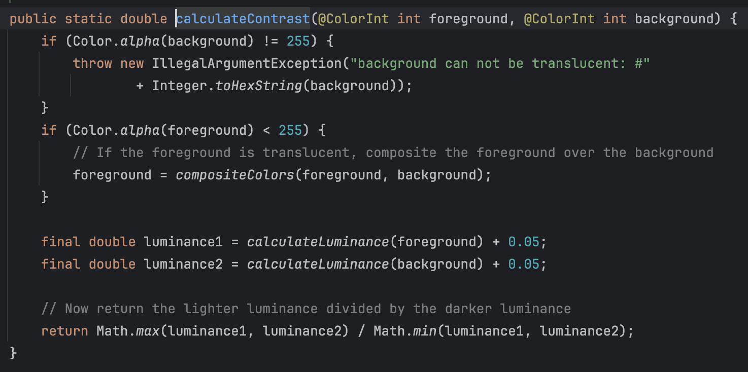 val contrast = ColorUtils.calculateContrast(foregroundColor, backgroundColor)
