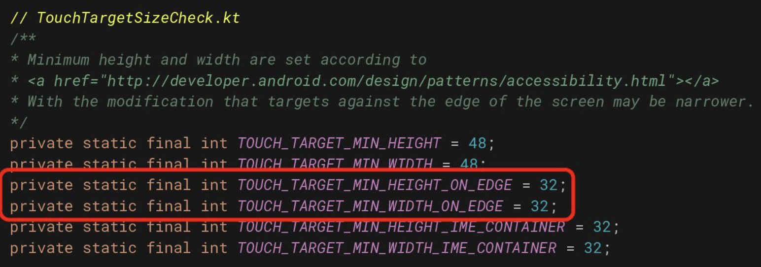 바로 아래의 ON_EDGE가 하이라이팅 된 영역을 보시면 32dp로 선언되어 있습니다. 이는 버튼이 화면의 가장자리에 있을 경우 터치 가능한 영역이 제한적이기 때문에 32dp를 권장하는 것입니다.