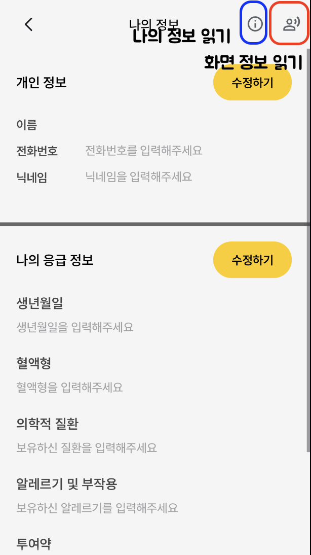 화면에 대한 설명을 듣고 싶으시다면 화면 최상단 오른쪽에 위치한 화면정보읽기버튼을 눌러주세요