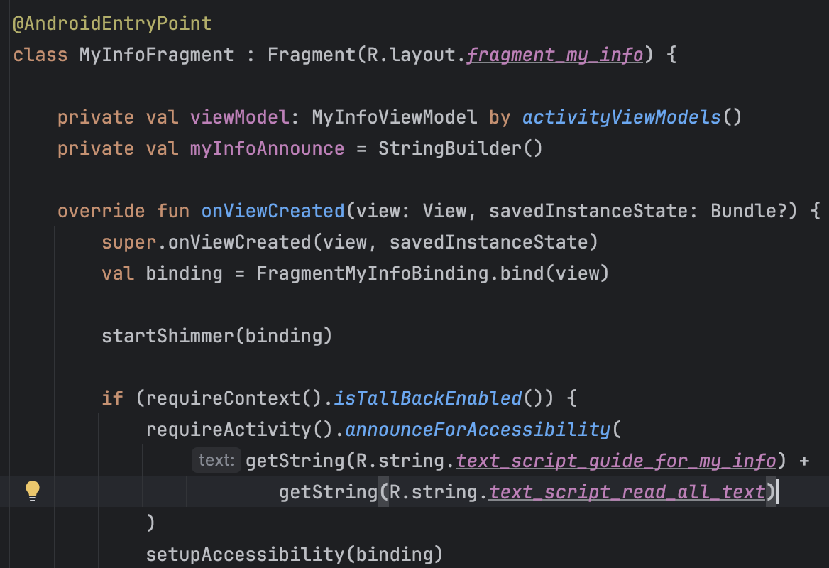 이때, hintText를 null로 만드는 이유는 TextView에 Hint가 설정되어 있을 경우 우리가 읽고자 하는 새로운 텍스트를 읽은 후 힌트도 같이 읽어주기 때문에 이러한 TallBack의 기본 동작을 막기 위함입니다.