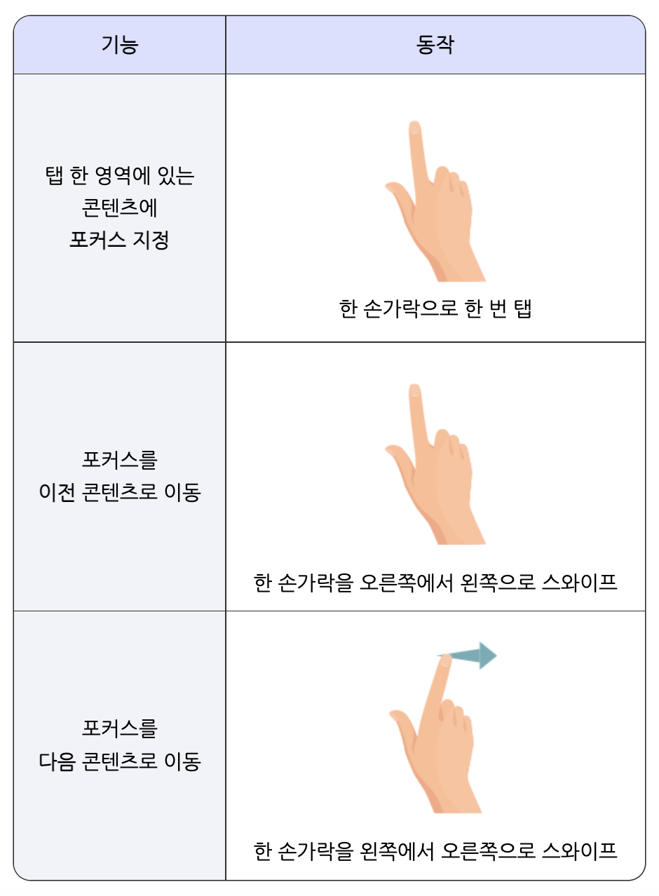 아래 영상 링크에서 보시면 기본 동작은 왼쪽에서 오른쪽으로 위에서 아래로 화면을 스와이프 할 때마다 포커싱이 이동하며 화면의 구성요소들을 읽어줍니다.