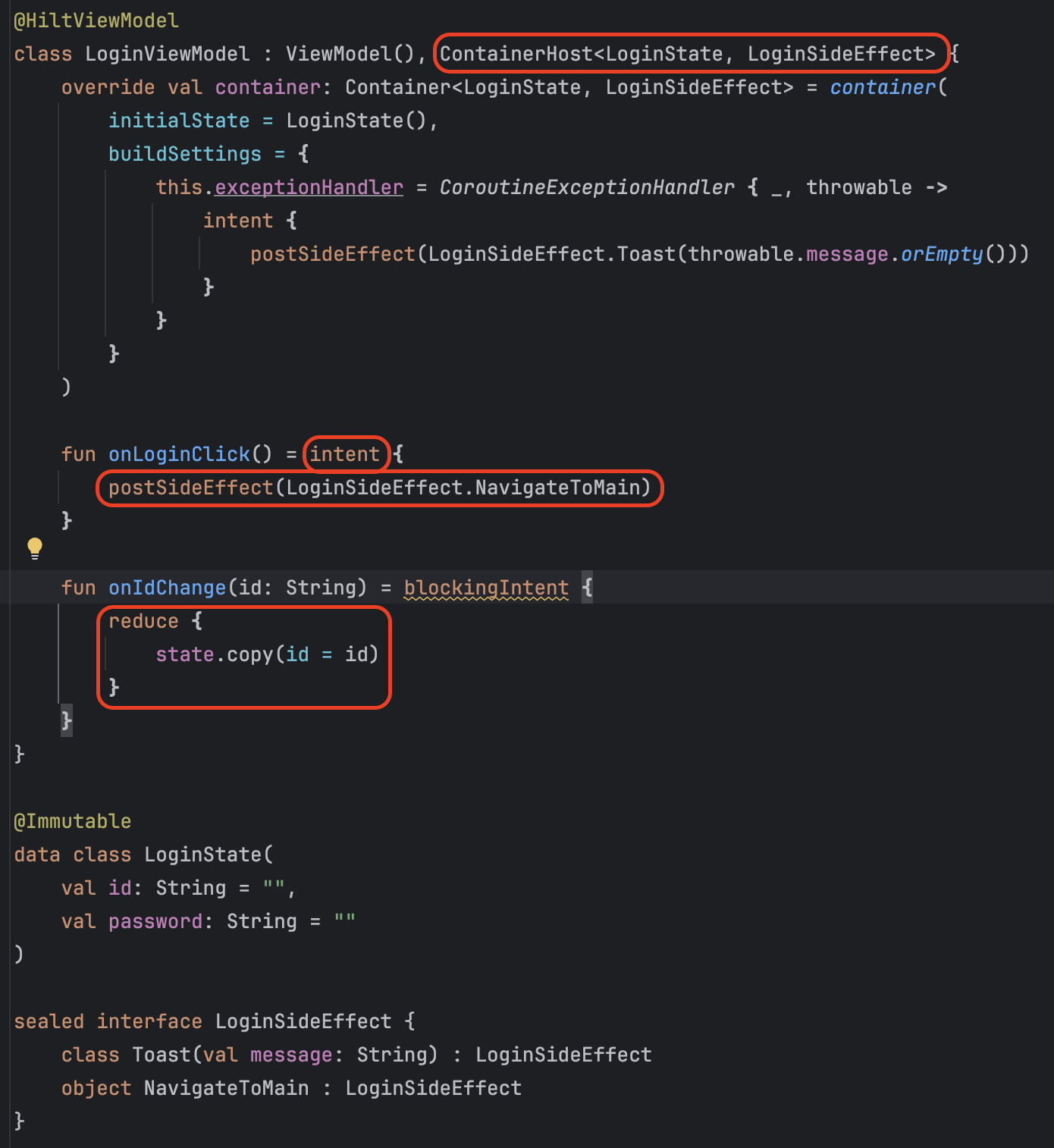 - ViewModel은 ContainerHost를 구현해 상태 관리를 위한 컨테이너가 됩니다.