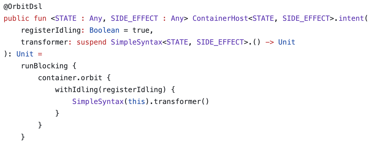 * 확장 함수인 `intent`와 `orbit`은 컨테이너에서 orbit 인텐트를 실행하는 편리한 방법을 제공합니다.