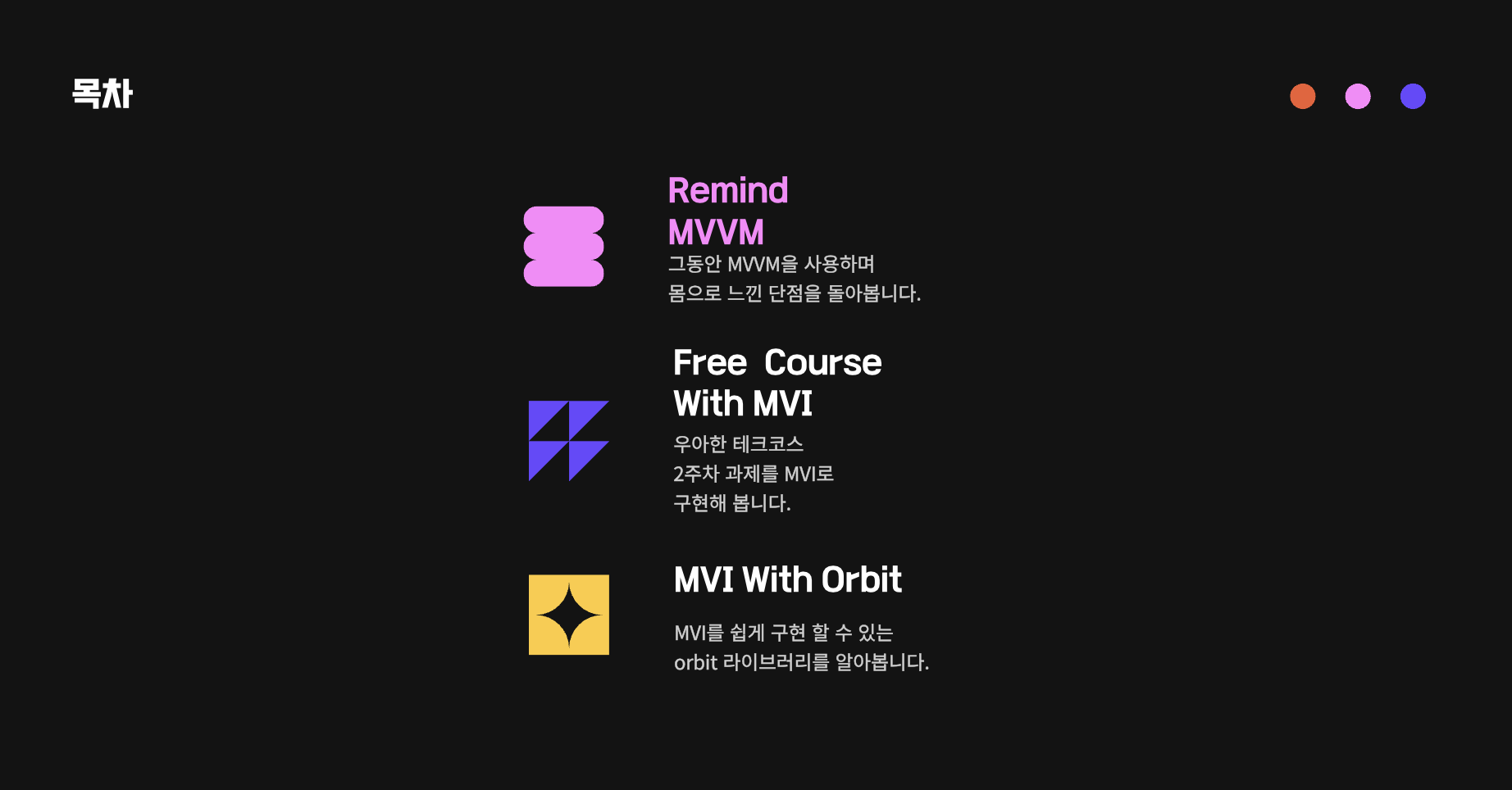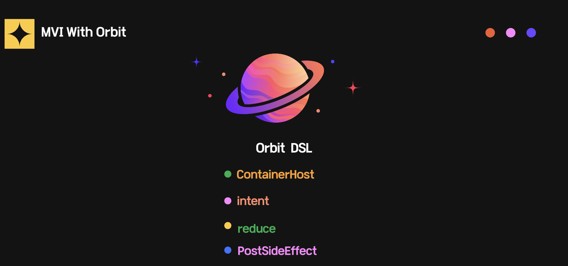 MVI의 단점으로 꼽는 것이 높은 러닝 커브와 다수의 보일러 플레이트 코드인데요, 이러한 장벽을 낮출 수 있게 도와주는 것이 Orbit입니다. Orbit은 3가지의 주요 DSL(intent, reduce, postSideEffect)을 활용하여 보일러 플레이트 코드 없이 상태와 사이드 이펙트를 관리할 수 있는 간결한 API를 제공합니다.