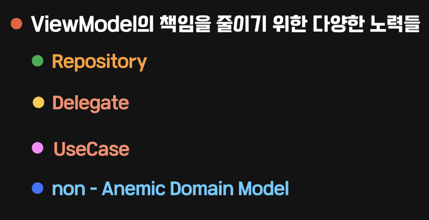 프로젝트를 진행하면서 ViewModel이 아키텍처로서의 ViewModel과 View에 필요한 데이터 홀더로서의 역할을 함께 수행하다 보니 자연스럽게 비대해지는 문제가 발생했습니다. 이를 해결하기 위해 다음과 같은 방법을 사용했습니다.