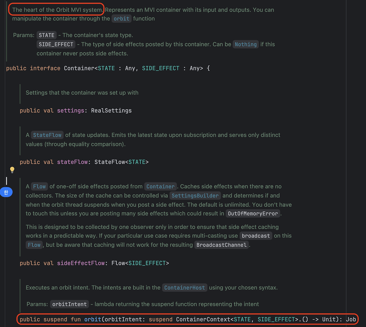 이 컨테이너는 MVI 패턴에서 입력과 출력을 처리하는 역할을 합니다. 컨테이너는 orbit 함수를 통해 조작할 수 있습니다.