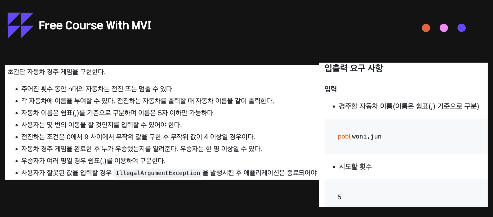 미션은 간단한 자동차 경주 게임을 구현하는 것입니다. 사용자의 액션에 의해 발생할 이벤트인 "자동차 이름 입력"과 "시도 횟수 입력" 두 가지를 상태 관리 클래스로 정의해 주었습니다.