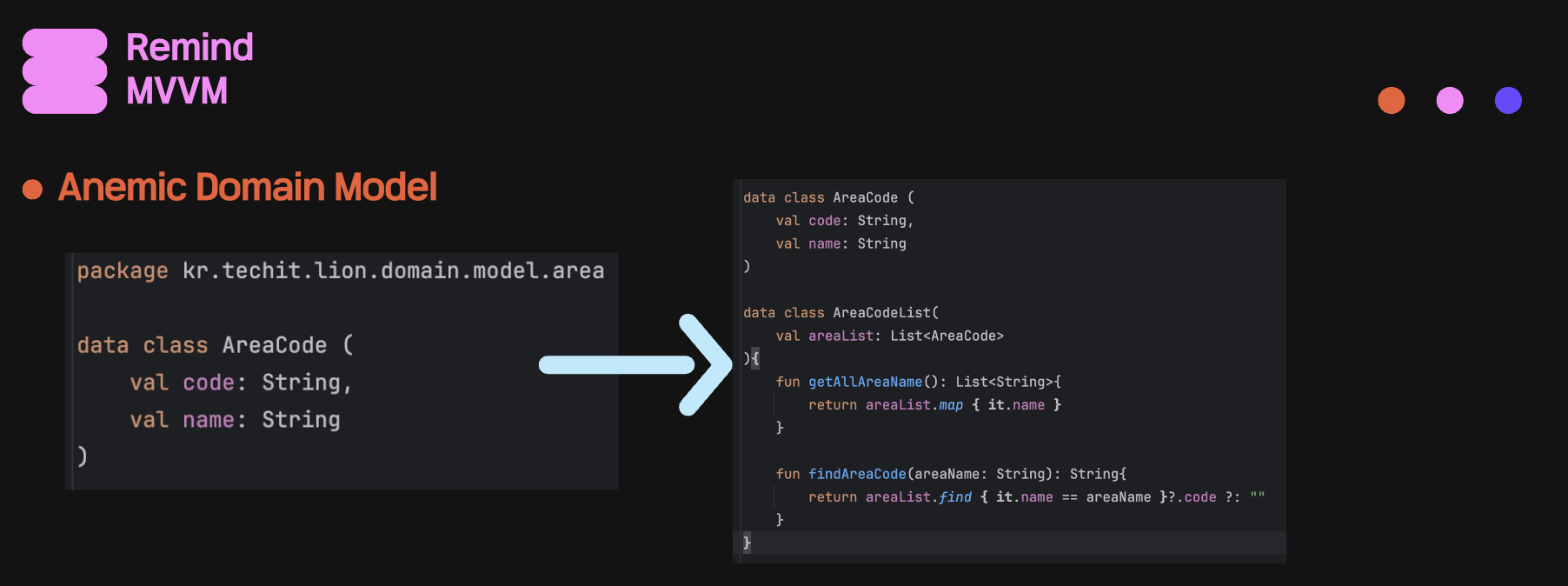 이 리스트에서 특정한 지역의 이름이나 지역 코드를 출하는 로직이 ViewModel에 위치했고 이는 ViewModel을 비대하게 만드는 원인 중에 하나였습니다. 그래서 저는 이런 로직을 도메인 모델 스스로의 책임으로 가지도록 설계했습니다.