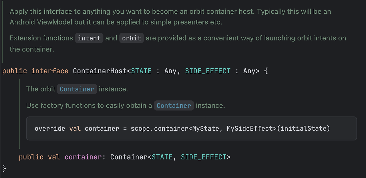 즉, 이 컨테이너는 상태(State)를 관리하며 필요에 따라 부수 효과(Side Effect)를 발생시킬 수 있는 구조입니다. 그리고 orbit 함수는 이를 조작하는 주요 함수라고 합니다. Container는 ContainerHost 인터페이스의 프로퍼티로 선언되어있습니다.