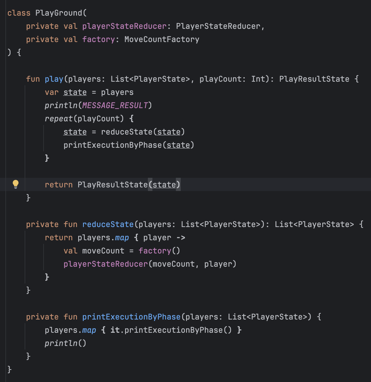 최종적으로 자동차 경주 게임을 수행하는 Class에서 State Reducer와 funtional Interface의 구현체를 주입받아 자동차 경주 게임을 수행합니다.