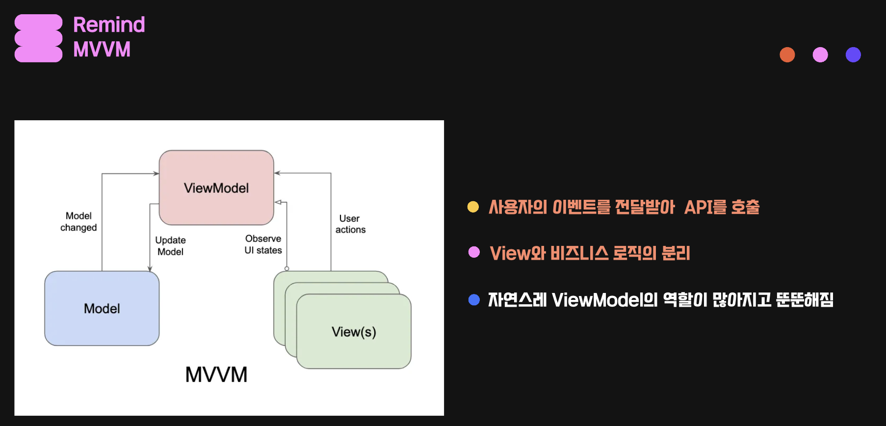 ViewModel은 이 요청을 비즈니스 로직에 따라 처리하고, 필요한 데이터를 Model에 요청합니다. Model은 데이터 소스(예: API, 데이터베이스)에서 데이터를 가져와 ViewModel에 전달하고, ViewModel은 필요에 따라 이 데이터를 가공하여 View에 전달하며 View는 이를 화면에 렌더링 하여 사용자에게 보여줍니다.