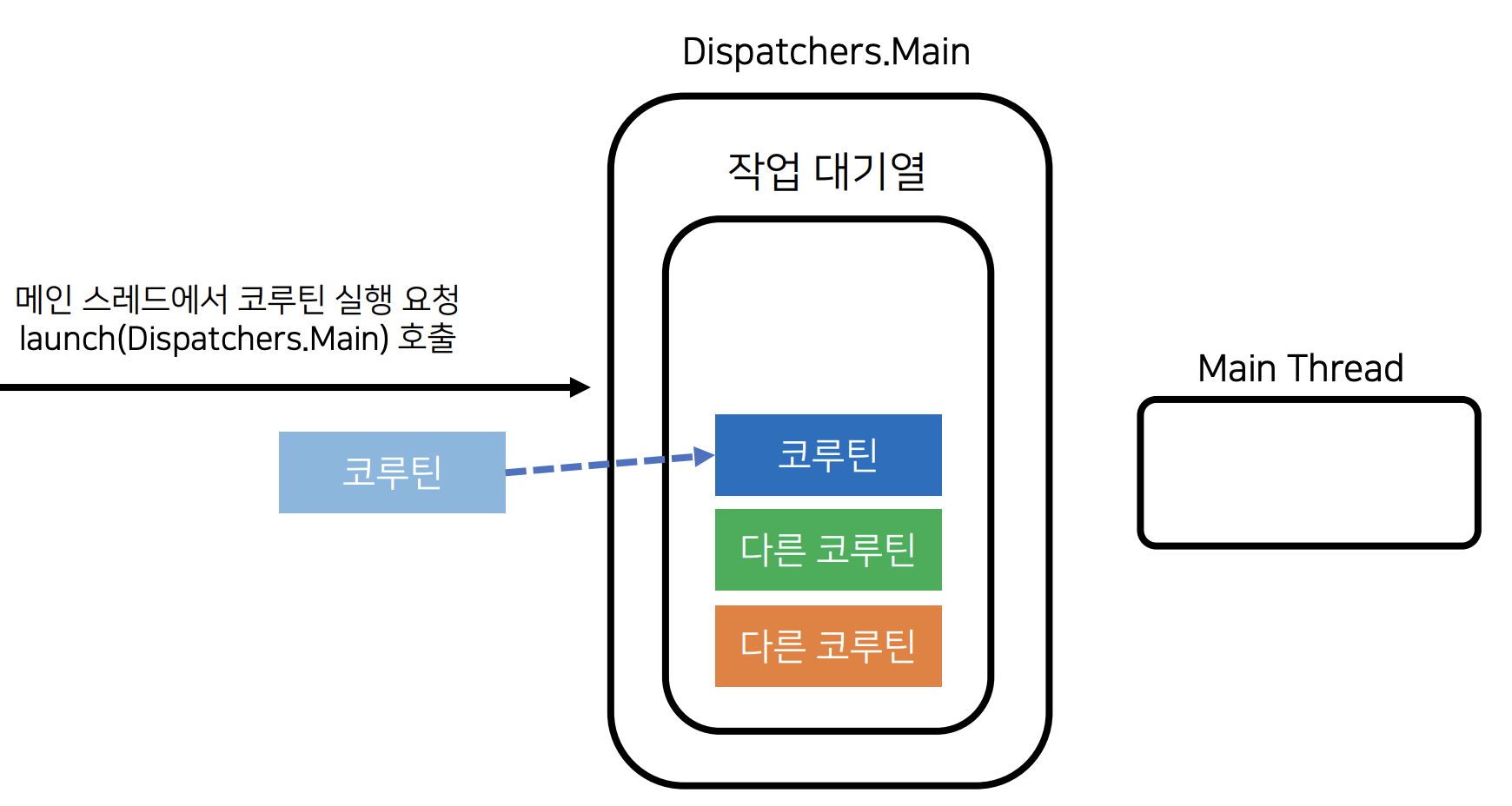 이 경우 Dispatchers.Main을 사용하며 Dispatchers.Main은 코루틴을 작업 대기열에 적재한 후 Main Thread가 비었을 때 코루틴을 Dispatch 합니다.