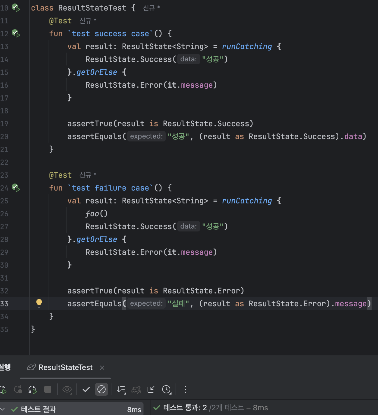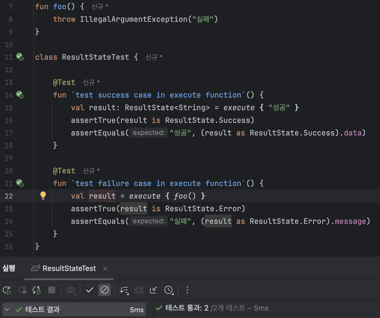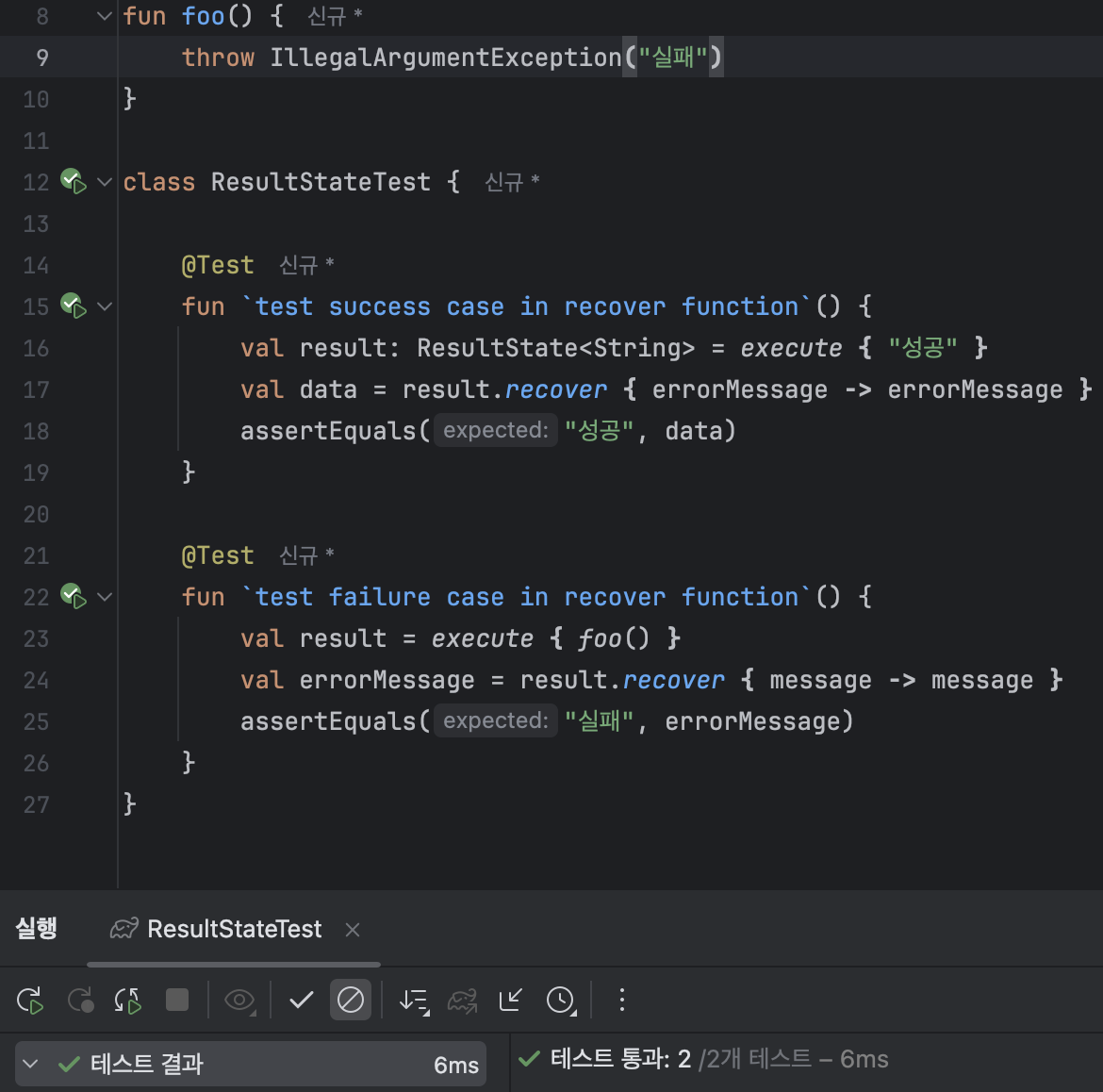 ResultState를 테스트했을 때 예외가 반환되는 것을 확인했습니다. 하지만 현재 코드에선 매번 에러처리할 위치에 runCatching을 구문으로 인한 보일러 플레이트 코드가 늘어나므로 하나의 함수로 추출하겠습니다.