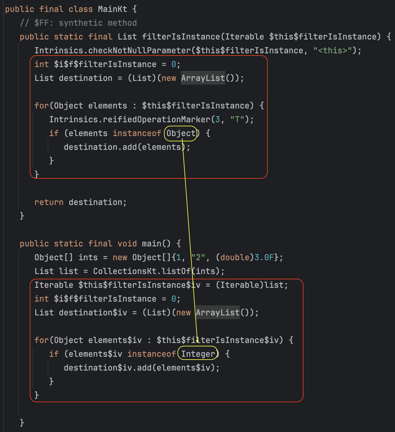 디컴파일 된 코드를 보면 filterIsInstance 함수의 본문이 호출 지점에 삽입됩니다. 또한 함수 본분에선 타입 소거로 인해 Object로 대체되지만 실제 호출 지점에선 구체화된 타입을 유지하는 것을 확인할 수 있습니다.