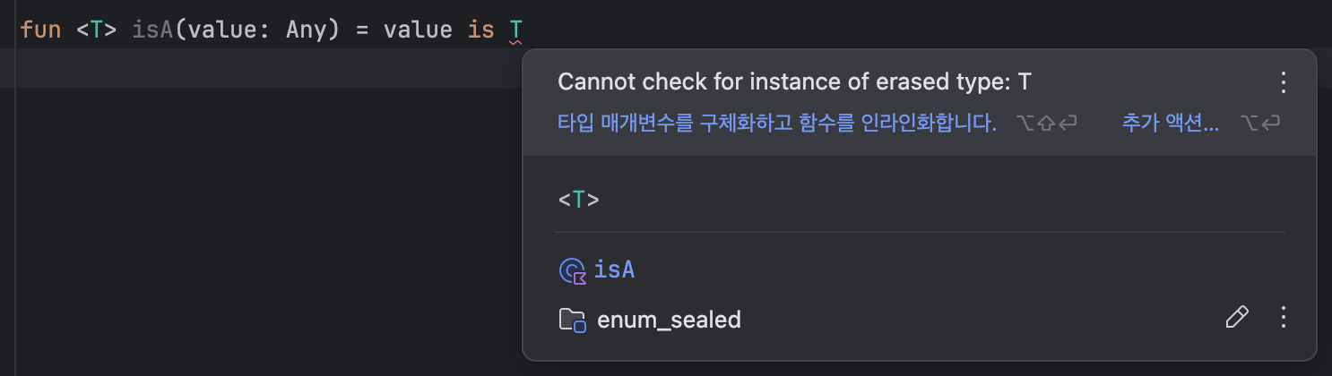 제네릭 함수는 함수 내부에서 호출 시 전달된 타입 인자를 알 수 없습니다. 이는 지금껏 살펴본 타입 소거(type erasure) 때문으로 런타임에 타입 정보가 지워지기 때문입니다. 따라서 이런 제네릭 함수에서 타입 정보를 활용하고 싶다면 inline 함수로 바꿔야 합니다.