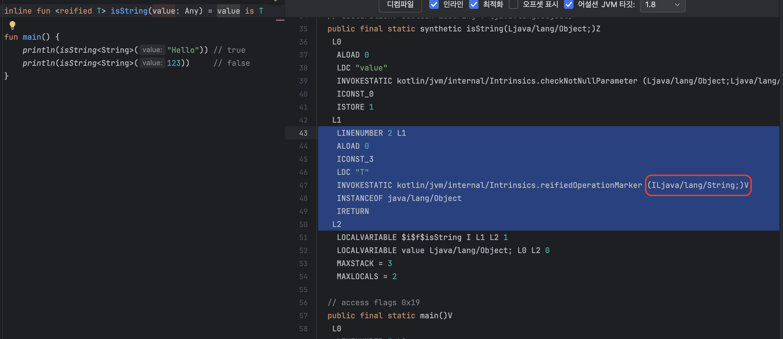 컴파일러는 인라인 함수의 바이트코드를 함수가 호출되는 지점에 삽입(인라이닝) 합니다. 따라서 컴파일러는 실체화된 타입 인자를 사용해 인라인 함수를 호출하는 각 부분의 정확한 타입 인자를 알 수 있습니다.