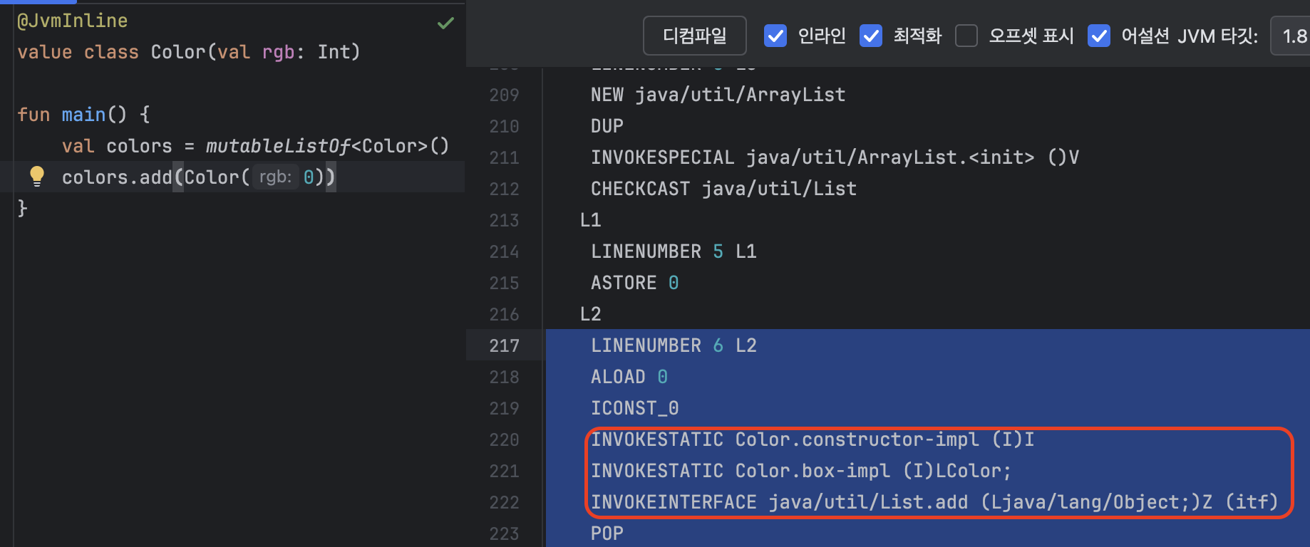 value class를 디컴파일해보면 box-impl, unbox-impl 같은 정적 메서드가 생성되어 있는 것을 확인할 수 있습니다. 이 메서드들은 박싱과 언박싱을 수행하는 메서드입니다. 위 코드에서도 Color(0)이 리스트에 추가될 때 내부적으로는 Color.box-impl(0)과 같은 메서드가 호출되어 객체가 생성되고, 해당 객체가 리스트에 저장됩니다.